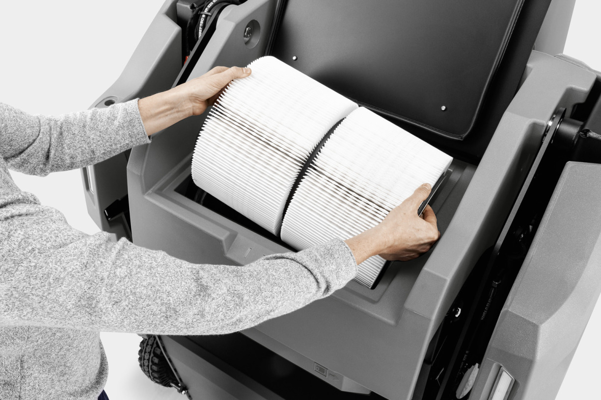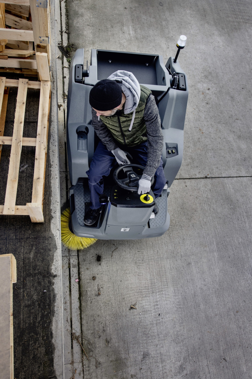 La KM 100/120 R Lithium-Ion est une balayeuse aspirante autoportée très robuste de taille moyenne. En raison de son alimentation par batterie, elle est tout indiquée pour les espaces intérieurs. La batterie Lithium-Ion de 160 Ah fournit suffisamment d'énergie pour accomplir des tâches de nettoyage diverses et variées pendant quatre heures. La capacité de la batterie disponible peut être consultée à tout moment sur l'écran. La machine garantit un excellent résultat de balayage grâce au rouleau-balai à suspension oscillante, y compris à la vitesse de travail maximale de 6 km/h. La brosse latérale escamotable protège le mobilier et la machine. La grande cuve à déchets peut être relevée jusqu'à une hauteur de 1,52 mètre, ce qui offre la possibilité de la vider dans les conteneurs les plus divers. Le système à filtre rond éprouvé, doté d'une surface filtrante étendue et d'un décolmatage automatique du filtre, permet un balayage sans dégagement de poussière. Le siège conducteur peut être ajusté en fonction de l'utilisateur afin d'offrir une bonne vue sur la brosse latérale et la zone de travail. Tous les éléments de commande sont disposés de façon claire et facilement accessibles. Les pièces concernées par la maintenance sont faciles d'accès, le filtre et le rouleau-balai peuvent être démontés sans outils. La batterie Lithium-Ion et le chargeur sont inclus dans la livraison.