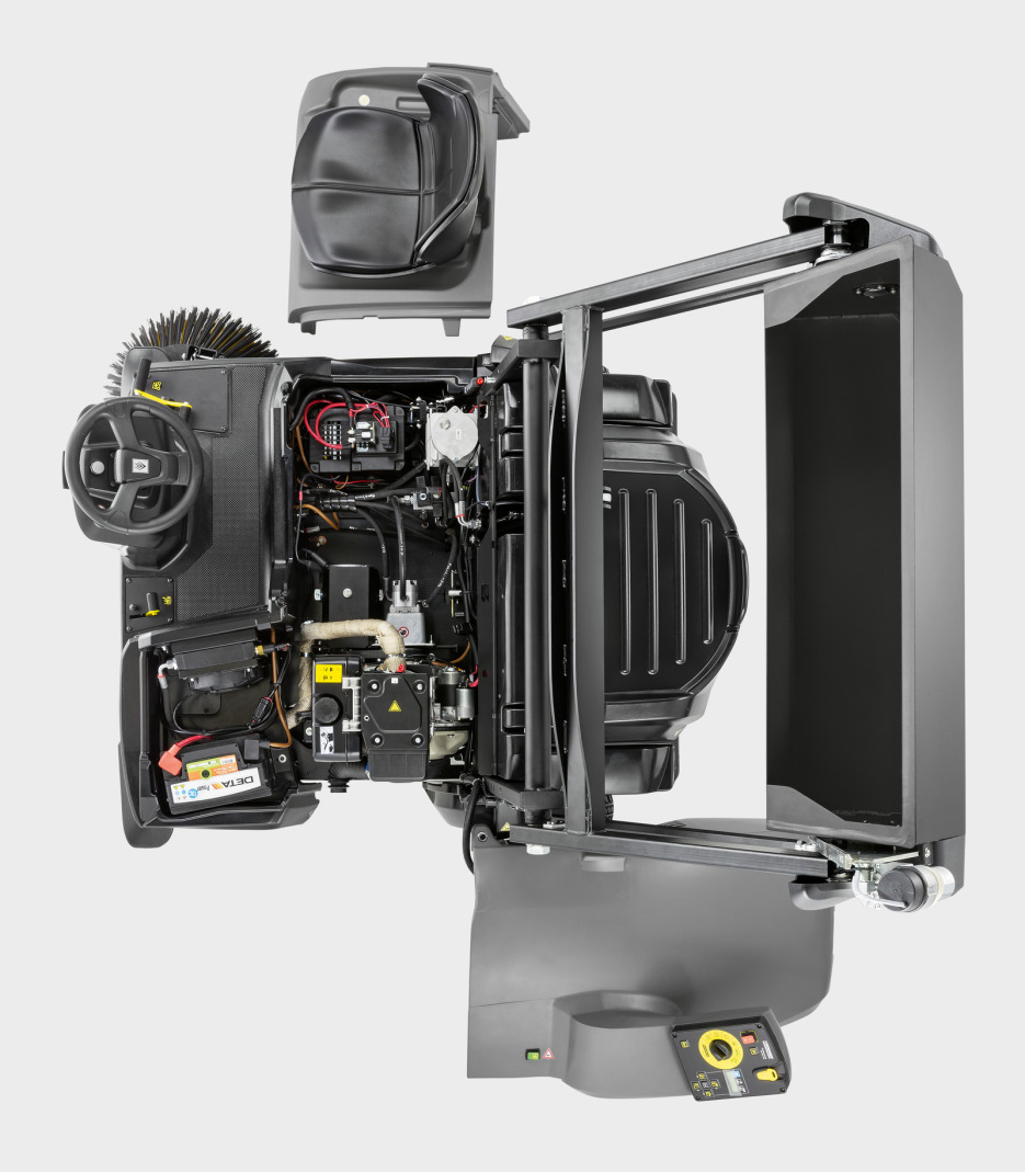 Fini le balayage manuel des coins ! Notre balayeuse autoportée à moteur à diesel KM 125/130 R D+KSSB rend ce gros boulot superflu. Grâce au balai latéral ventral, une innovation brevetée de Kärcher, vous pouvez nettoyer les coins en une seule étape de façon rapide et simple. La machine peut se vanter de divers brevets et de nombreuses fonctions pratiques comme le vidage en hauteur hydraulique du réservoir à déchets, le décolmatage du filtre complètement automatique Tact pour un nettoyage presque sans aucune émission de poussières et le système à clé 'Intelligent Key System' de Kärcher à l'aide duquel vous pouvez attribuer les droits aux différents utilisateurs. Le balai principal se trouve sur l'essieu arrière ce qui permet au machine de franchir les obstacles sans effort et en toute sécurité. En plus, la hauteur du balai principal est adaptée automatiquement au niveau de l'usure par lesystème 'Teach System'. L'accès a ce balai est d'ailleurs excellent à cette location. Vous avez le choix entre trois niveaux de pression des brosses différents, en fonction du degré de la salaté et du type de la surface. Et finalement il est aussi possible de contrôler la pression des brosses et le niveau de l'usure sur l'écran multifonctionnel.