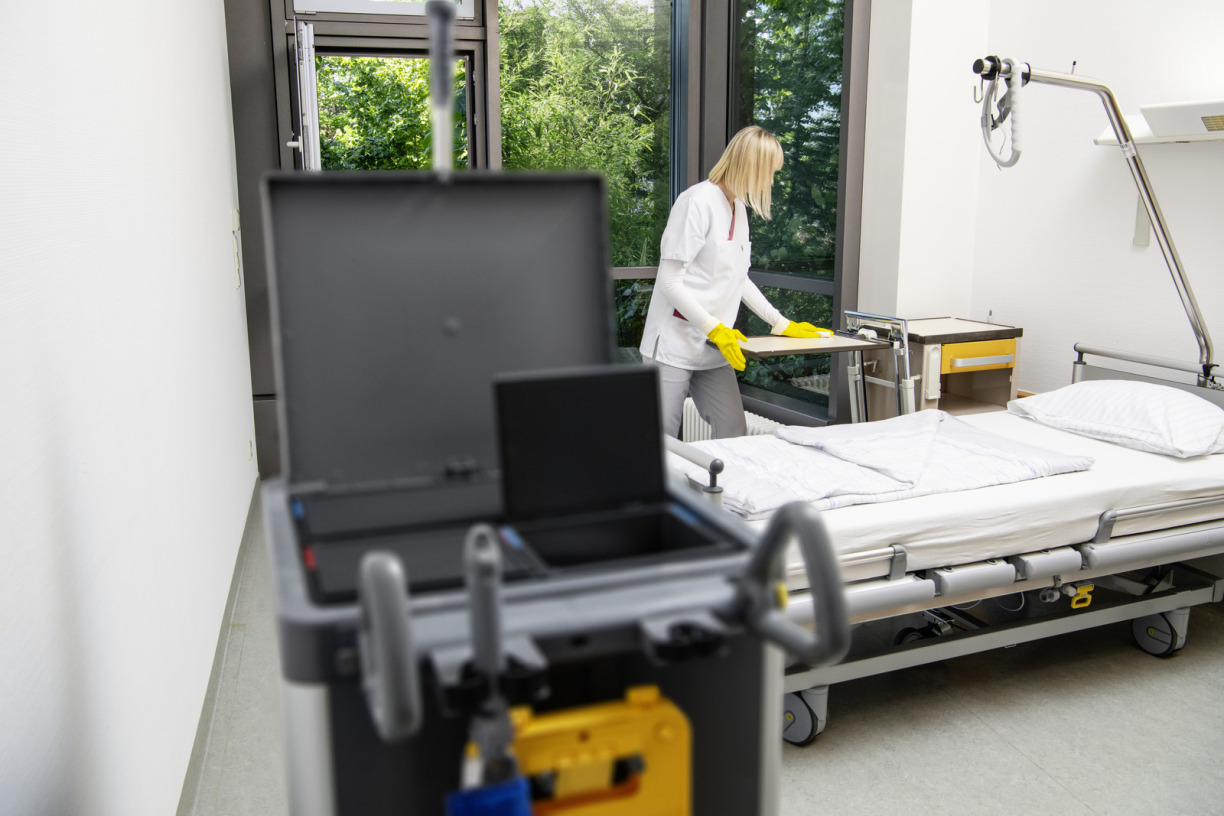 Pour l'utilisation dans les zones particulièrement sensibles sur le plan de l'hygiène, le FM ExpertPro 50/ P compact est tout indiqué en raison de sa structure fermée. Également pour l'utilisation de la méthode de préconditionnement pour un nettoyage efficace des surfaces. 2 seaux de 6 litres permettent de ranger les équipements et de les séparer selon leur utilisation. Ce chariot dispose en outre d'un tiroir de 16 litres à fixation individuelle et amovible qui offre une possibilité pratique d'emporter d'autres ustensiles de nettoyage. Les raccords Toolflex inclus permettent l'intégration de balais à plat, de pinces ou autres. Le crochet sert à fixer un panneau d'avertissement ou le WVP 10 Adv. Aussi bien les raccords Toolflex que le crochet peuvent être mis en place de manière variable sur l'extérieur du FlexoMate. Deux des roues sont équipées de freins garantissant un stationnement sûr, même sur les sols en pente. La poignée FlexoGrip réglable en hauteur réduit la sollicitation des bras et des épaules de l'utilisateur lorsqu'il pousse le chariot. Les portes et les parois latérales peuvent être personnalisées à l'aide d'autocollants et les portes Push-to-open peuvent être configurées individuellement pour les droitiers et les gauchers.