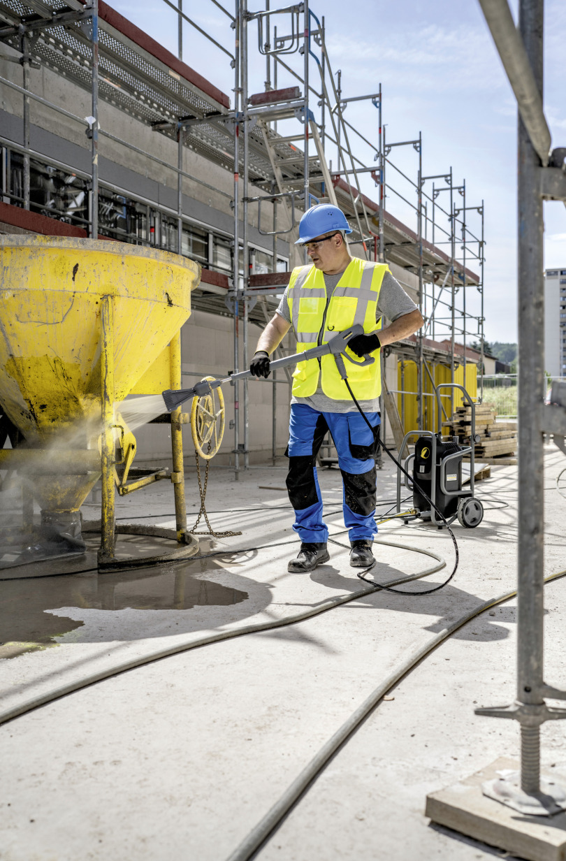 Kärcher fête ses 90 ans : le nettoyeur haute pression non chauffé HD 6/15 M Cage Anniversary Edition en noir est à la hauteur de toutes les situations dans les conditions rudes de l'utilisation professionnelle quotidienne, qu'il soit utilisé à la verticale ou à l'horizontale. L'appareil mobile, très robuste et fonctionnant sur courant triphasé est équipé d'une nouvelle pompe axiale à 3 pistons avec culasse en laiton permettant jusqu'à 20 % de puissance de nettoyage et d'efficacité énergétique en plus. Afin de protéger tous les composants haute pression, une décompression automatique est intégrée et pour la pompe en elle-même, un filtre à eau supplémentaire est installé. L'appareil possède une conception qui facilite grandement l'entretien et est équipé d'un cadre tubulaire en acier à revêtement par pulvérisation grâce auquel le nettoyeur haute pression résiste sans problèmes aux conditions les plus rudes. L'équipement de série comprend également notre pistolet haute pression EASY!Force innovant, qui s'appuie sur le recul du jet haute pression pour réduire à zéro l'effort de maintien, ainsi que les attaches rapides EASY!Lock pour une manipulation 5 fois plus rapide qu'avec les raccords classiques. La fourniture de l'édition anniversaire inclut une buse eco!Booster ainsi qu'une lance d'arrosage de 600 millimètres.